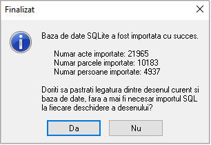 Pe lângă menținerea tuturor fișierelor CGXML într-un mod centralizat, baza de date SQLite permite reconstrucția ulterioară a tuturor fișierelor CGXML, dar și extragerea unor fișiere CSV pentru acte și persoane, conform structurilor obligatorii solicitate de comenzile [F28. Import/Export date persoane] și [IEACTE (import/export acte proprietate)]. La final, programul va afișa un mesaj informativ de încheiere a procesului de generare a bazei de date.