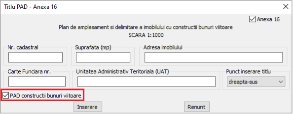 ● Pentru aplicațiile TOPOGRAPH9.0 MENTENANȚĂ și TOPOGRAPH10 MENTENANȚĂ, începând cu noul update, comanda [F5. PAD automat A4-A0] include opțiunea păstrării textului pentru mențiunile terenului de la un model PAD la altul, la fel ca și în cazul textelor pentru adresa imobilului, denumirea UAT-ului sau a datelor pentru autorizați.