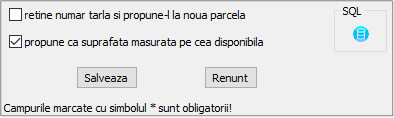 După selectarea bazei de date SQL, programul va afișa o casetă informativă privind numărul de acte, parcele și persoane importate. De asemenea, se poate confirma păstrarea legăturii dintre desenul curent și baza de date SQL. După importul datelor, la apelarea comenzii [F21. Adaugare/editare date imobil], în casetele de introducere/editare a datelor parcelelor, înscrierilor și persoanelor se va putea utiliza butonul-imagine SQL. După acționarea butonului SQL, programul va afișa o casetă de dialog conținând datele disponibile din baza de date. În cazul casetei de dialog, pentru adăugarea sau editarea datelor unei parcele, butonul SQL este amplasat în partea de jos a casetei, ca în imaginea următoare: