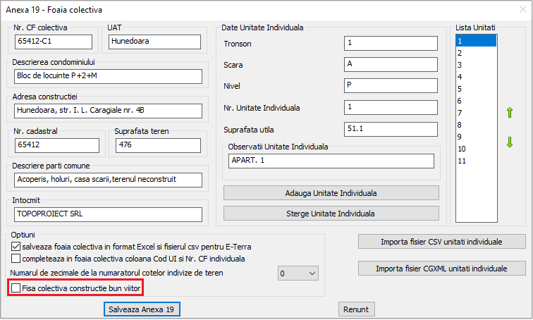 ● Pentru aplicația de cadastru sistematic TOPOGRAPH10 MENTENANȚĂ comanda [F21. Adaugare/editare date imobil] a fost modificată în ceea ce privește introducerea/editarea datelor referitoare la descrierea spațiilor de folosință comună pentru imobilele de tip condominiu. Astfel, începând cu noul update, caseta de dialog pentru introducerea/editarea datelor unei unități individuale a fost modificată, conform imaginii urmatoare: