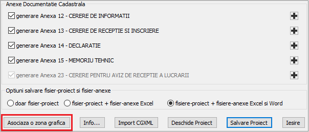 ● Pentru aplicațiile TOPOGRAPH9.0 MENTENANȚĂ și TOPOGRAPH10 MENTENANȚĂ, comanda [F19. Proiect Documentatie Cadastrala] include o opțiune nouă. Astfel, în caseta de dialog Proiect Documentatie Cadastrala, a fost introdus un buton nou, denumit Asociaza o zona grafica, ca în imaginea următoare: