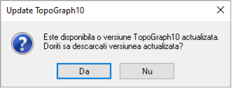 Bifarea acestui comutator oferă posibilitatea ca, la fiecare pornire a programului AutoCAD sau BricsCAD aplicația să afișeze - după caz - o casetă informativă privind existența unei versiuni TopoGraph9.0 sau TopoGraph10 actualizate. Această opțiune va avea efect numai pentru licențele instalate și aflate în perioadă de mentenanță valabilă (pentru care data update-ului disponibil să fie anterioară datei de expirare a mentenanței).