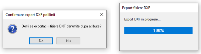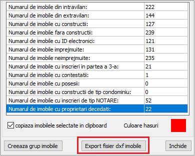 După evidențierea unei categorii de imobile din lista Informații imobile și acționarea noului buton, programul va afișa o casetă de salvare a unui fișier .dxf cu imobilele din categoria selectată. Pentru fișierul .dxf se propune aceeași denumire ca și cea a fișierului dwg.