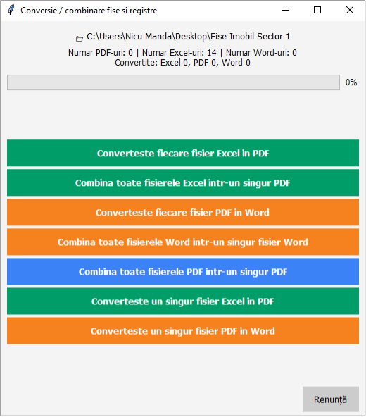 ● Pentru aplicația de cadastru sistematic TOPOGRAPH10 MENTENANȚĂ, comanda [F22. Genereaza anexe cadastru] a fost modificată în ceea ce privește opțiunea de conversie a fișelor de date și a registrelor cadastrale din formatul Excel în PDF. Astfel, după apelarea comenzii și utilizarea subopțiunii (C) pentru conversie, programul va afișa o casetă de selecție a directorului fișierelor Excel pentru fișe sau registre. Pe lângă fișiere Excel, directorul selectat poate include și fisiere PDF sau Word. După alegerea directorului, programul va lansa o aplicație de conversie integrată care permite un număr de 7 tipuri de conversii, cu plecare de la formatul Excel al fișelor de date și/sau registrelor cadastrale. După lansarea aplicației integrate se va putea lucra în paralel, atât cu desenul .dwg, cât și cu aplicația de conversie (de exemplu, în situația în care există un număr mare de fișiere Excel în directorul selectat). Aplicația de conversie integrată va afișa o casetă de dialog de forma: