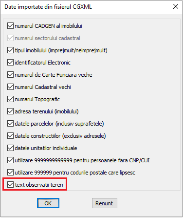 ● Pentru aplicația de cadastru sistematic TOPOGRAPH10 MENTENANȚĂ, comanda [F21. Adaugare/editare date imobil] include o opțiune nouă în ceea ce privește numărul de articole care se pot importa dintr-un fișier CGXML. Astfel, începând cu noul update, în lista articolelor disponibile pentru import, a fost introdus un nou articol, respectiv textul observațiilor terenului. Până la data prezentului update, acest text era preluat în mod automat din fișierul importat, prin suprascrierea - după caz - a textului existent.