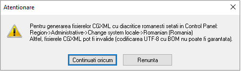 ● Pentru aplicația de cadastru sistematic TOPOGRAPH10 MENTENANȚĂ, la apelarea comenzii [F25. Generează fișiere CGXML], a fost introdusă o etapă de verificare a setărilor din secțiunea Control Panel -> Region a sistemului de operare. Aceste setări sunt obligatorii pentru utilizarea și afișarea corectă a diacriticelor românești din cuprinsul fișierelor CGXML generate. Astfel, în cazul în care nu au fost efectuate aceste setări, programul va afișa o casetă de dialog de forma: