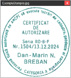 Butoanele Alege stampila PFA... și Alege stampila PJA... permit selectarea unor fișiere-imagine de tip .jpg, .png, .tif, .bmp sau .gif, reprezentând imaginile scanate ale ștampilelor. Aceste imagini trebuie să fie de formă aproximativ pătrată (cu număr aproximativ egal de pixeli pe orizontală și verticală). Butonul-imagine din partea din dreapta-sus a casetei de dialog permite vizualizarea unui model de ștampilă ca fișier de tip .jpg (ExempluStampila.jpg). Ștampilarea fișelor de date ale imobilelor va fi posibilă numai cu condiția alegerii a cel puțin a unei ștampile și a bifării comutatorului denumit ștampilare fișe din caseta de dialog a setărilor generale CADGen.