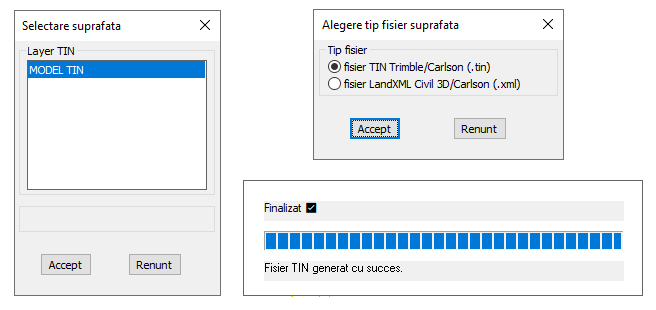 ● Pentru aplicațiile TOPOGRAPH9.0 MENTENANȚĂ și TOPOGRAPH10 MENTENANȚĂ, comanda [H4. Salvare model TIN] a fost modificată. Astfel, după apelarea comenzii și alegerea layerului modelului TIN, programul va afișa o casetă de dialog care include două opțiuni privind tipul de fișier pentru salvarea modelului 3D al terenului. Prima opțiune permite salvarea modelului TIN ca fișier de tip Trimble/Carlson cu extensia .tin. Cea de-a doua opțiune permite salvarea modelului TIN ca fișier de tip LandXML Civil 3D/Carlson cu extensia .xml.