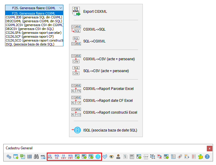 După cum se poate observa, articolul de pe prima poziție este comanda de generare a fișierelor CGXML, urmată de 8 comenzi noi ce utilizează fișiere CGXML și baze de date SQLite. Noile comenzi sunt disponibile și din bara de instrumente Cadastru General, dar și din ribbon-ul CADGen, utilizând meniul derulant de sub butonul de generare a fișierelor CGXML.