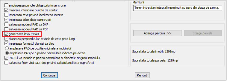 Comutatorul evidențiat cu albastru în imaginea anterioară permite ca, după desenarea automată a PAD-ului să se salveze un fișier de tip .txt sau .doc privind calculul analitic al suprafeței terenului (similar cu anexa rezultată prin utilizarea comenzii F13).