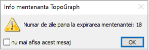● Pentru aplicațiile TOPOGRAPH9.0 MENTENANȚĂ și TOPOGRAPH10 MENTENANȚĂ, începând cu noul update, a fost inclusă o opțiune nouă privind afișarea termenului de expirare a perioadei de mentenanță. Astfel, în situația în care mentenanța va expira într-un termen mai mic de 31 de zile, la pornirea AutoCAD sau BricsCAD va fi afișată o casetă de dialog de forma: