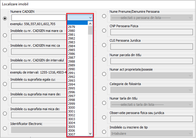 În cadrul comenzii [F24. Localizeaza imobil in plan], a fost introdus criteriul nou de localizare după categoria de folosință, ca în imaginea de mai jos.