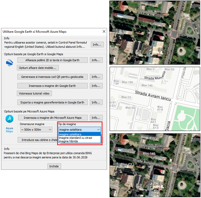 ● Pentru aplicațiile TOPOGRAPH9.0 MENTENANȚĂ și TOPOGRAPH10 MENTENANȚĂ comanda [H15. Google Earth...] include o opțiune nouă în ceea ce privește inserarea de imagini statice folosind serviciul Microsoft Azure Maps. Astfel, în caseta de dialog, a fost amplasată o listă derulantă care permite alegerea tipului de imagine. Sunt disponibile 3 tipuri de imagini, respectiv: o imagine satelitară, o imagine standard cu străzi și o imagine hibridă (satelitară cu etichete).