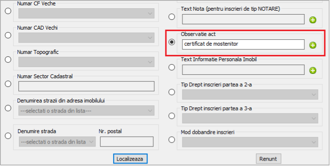 Acționarea butonului + permite accesul la o listă prestabilită de observații act, oferind astfel rapiditate în procesul de introducere a datelor actului.