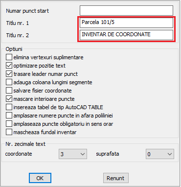 ● Pentru aplicațiile TOPOGRAPH9.0 MENTENANȚĂ și TOPOGRAPH10 MENTENANȚĂ, comanda [C2. Plasare puncte si inventar] include o opțiune nouă care permite păstrarea textelor introduse pentru titlurile tabelului de coordonate de la o polilinie la alta.