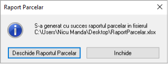 La final, programul va afișa un mesaj informativ de finalizare a raportului, cu opțiunea de deschidere a fișierului Excel, de forma: