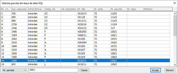 Caseta de dialog include, în partea de jos, un buton de căutare a unei parcele. Se va selecta din lista derulantă câmpul (criteriul) dorit, se va introduce valoarea acestuia, iar apoi, se va acționa butonul Cauta. Acționarea succesivă a butonului Cauta permite evidențierea secvențială a tuturor parcelelor care corespund - după caz - criteriului selectat. Butonul Accept permite preluarea datelor parcelei în caseta de dialog Introducere/editare parcela. Aceeași interfață a fost introdusă și în cazul selecției datelor pentru acte și persoane, în casetele de dialog Introducere/editare inscriere și Introducere/Editare Titular/Persoana. Dacă desenul curent are deja asociată o bază de date SQL, prin reutilizarea comenzii ISQL se poate asocia o altă baze de date.