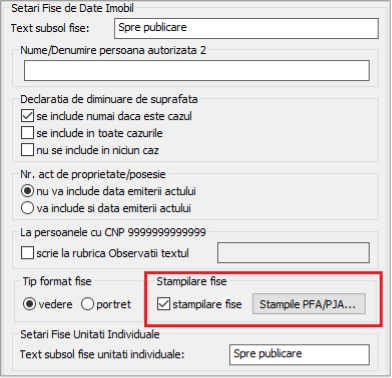 După apelarea comenzii [F22. Genereaza anexe cadastru] și alegerea fișelor de date ale imobilelor, caseta de opțiuni a fișelor de date include de acum și posibilitatea de alegere a formatului fișelor de date, respectiv vedere sau portret, ca în imaginea următoare.