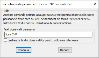 În cazul în care a fost setat anterior un text al obsevațiilor pentru persoanele fizice cu CNP neidentificat, în caseta de dialog, acesta va fi propus în mod implicit. Comanda este utilă în cazul în care s-a omis setarea opțiunii de completare automată a câmpului Observatii, la bifarea comutatorului CNP neidentificat.