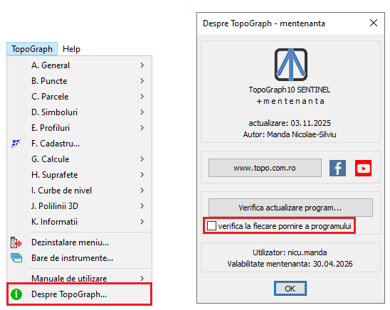● Pentru aplicațiile TOPOGRAPH9.0 MENTENANȚĂ și TOPOGRAPH10 MENTENANȚĂ, comanda [Despre TopoGraph...] de pe ultima poziție a meniului derulant include o opțiune nouă. Astfel, în caseta de dialog Despre TopoGraph – mentenanta, sub butonul denumit Verifica actualizare program... a fost introdus un comutator nou, denumit verifică la fiecare pornire a programului, ca în imaginea următoare: