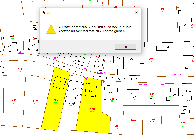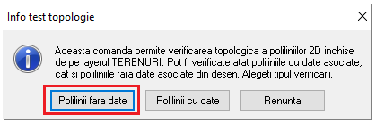 În cazul imobilelor fără date asociate (butonul Polilinii fara date), verificarea din punct de vedere topologic se va face după finalizarea întregului desen aferent sectorului cadastral. În cazul imobilelor cu date asociate (butonul Polilinii cu date), verificarea topologică se va face numai după asocierea datelor tuturor imobilelor din sectorul cadastral.