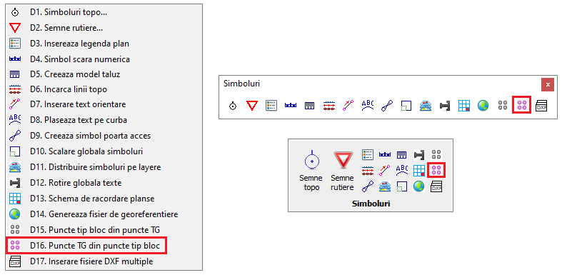 ● Pentru aplicațiile TOPOGRAPH9.0 MENTENANȚĂ și TOPOGRAPH10 MENTENANȚĂ în submeniul D. Simboluri a fost introdusă comanda nouă [D19. Copiere caseta cu obiecte]. Noua comandă poate fi apelată din meniu, din bara de instrumente Simboluri sau prin tastarea D19 la promptul de comandă și confirmarea cu Enter. Comanda permite selecția unor obiecte din interiorul unei casete de formă dreptunghiulară din desen și copierea acesteia în clipboard sau pe o altă poziție în desenul curent. Atunci când se dorește copierea obiectelor în desen se poate opta, fie pentru copierea casetei cu obiecte în desen ca entități (similare cu cele selectate), fie pentru copierea casetei cu obiecte în desen ca bloc anonim.