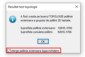 Zonele cu probleme depistate vor fi evidențiate cu roșu în interiorul sectorului cadastral. În aceste zone se va interveni ulterior în vederea eliminării problemelor apărute (se vor repoziționa vertexurile, se vor elimina spațiile și/sau intersecțiile). După efectuarea rectificărilor se vor actualiza datele imobilelor la care s-a intervenit, folosind opțiunea Utilizează geometria actuală din cadrul comenzii F21. Procedura de verificare topologică cu ajutorul comenzii TOPOLOGIE se va repeta de atâtea ori, până când rezultatul testului va consta în apariția unei singure polilinii de contur, amplasată pe marginea exterioară a sectorului cadastral, în layerul TOPOLOGIE. În acest caz va fi afișata o casetă de dialog de forma cele de mai jos. După rezolvarea problemelor de topologie se vor regenera fisierele CGXML cu ajutorul comenzii F25.