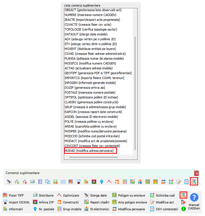 După cum se poate observa, articolul de pe prima poziție este comanda de generare a fișierelor CGXML, urmată de 8 comenzi noi ce utilizează fișiere CGXML și baze de date SQLite. Noile comenzi sunt disponibile și din bara de instrumente Cadastru General, dar și din ribbon-ul CADGen, utilizând meniul derulant de sub butonul de generare a fișierelor CGXML.
