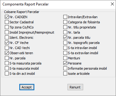 Comanda RAPORT permite realizarea unui raport parcelar extern în format .xls direct din desenul aferent sectorului cadastral. Functia este apelabila in orice moment, indiferent de stadiul desenului si de numarul imobilelor ce contin date asociate si permite verificarea vizuala globala a datelor de teren deja introduse (numere cadgen, numere cadastrale vechi, tipuri imobile, numere CF vechi, numere parcele, categorii de folosinta, suprafete, numere tarla, numere titluri, nume persoane etc).