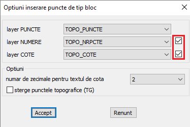 ● Pentru aplicațiile TOPOGRAPH9.0 MENTENANȚĂ și TOPOGRAPH10 MENTENANȚĂ, comanda [C2. Plasare puncte si inventar] include o opțiune nouă care permite păstrarea textelor introduse pentru titlurile tabelului de coordonate de la o polilinie la alta.